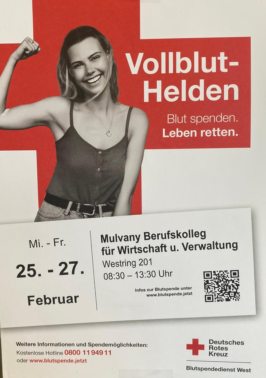 Vom 25.02. bis zum 27.02.26 gibt es wieder täglich in der Zeit von 8:30 bis 13:30 Uhr die Möglichkeit, auf dem Schulhof des Mulvany Berufskollegs Leben zu retten, indem man Blut spendet. Herzlich eingeladen sind alle Schüler*innen und Lehrer*innen des Mulvany Berufskollegs, aber auch all jene, die „einfach so“ zu Held*innen des Alltags werden wollen, Blut spenden und damit Leben retten möchten.